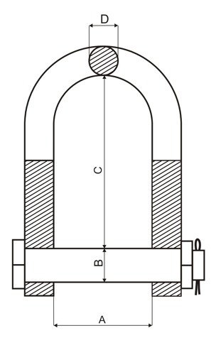 Manille en acier forgé, allongée avec dispositif de verrouillage avec boulon à tête hexagonale et écrou hexagonal avec goupille - type X écrou hexagonal avec goupille - type X, pour le levage de charges (objets, matériaux et marchandises) (objets, matériaux et marchandises), également pour les élingues en câble d'acier selon EN 13414-1 et les élingues en fibre selon EN 1492-1, EN 1492-2. L'utilisation de les manilles pour les élingues en sangle sont autorisées à condition que les manilles soient choisies pour avoir une WLL supérieure d'au moins 20% à celle des élingues une manille dont la WLL est supérieure d'au moins 20 % à celle de l'élingue.