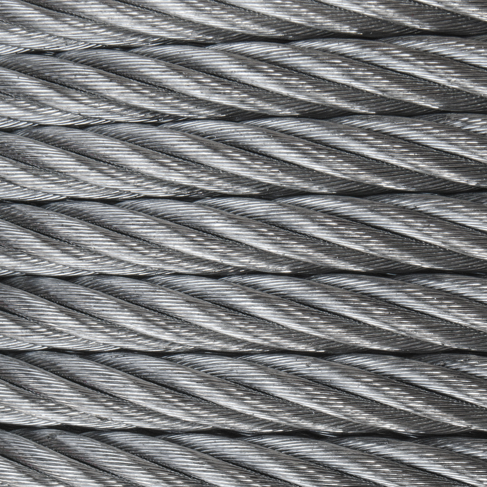 Tissage simple couche 1x7; 1 fil avec 7 fils enroulés en cercle. Corde très rigide avec une faible élasticité et une grande extensibilité. Galvanisation à chaud. DIN 3052